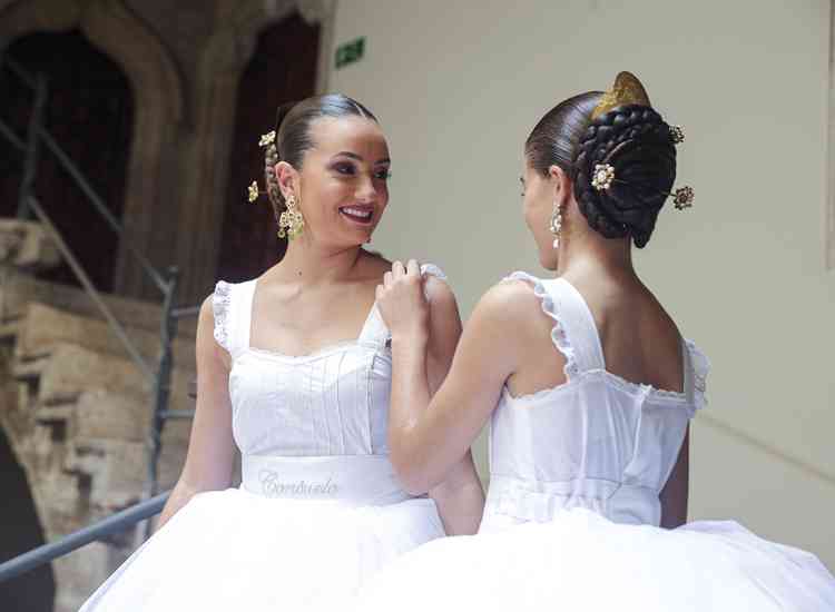 Consuelo y Carla lucen el Alçaor Modelo FMV personalizado con el detalle de sus nombres bordados en las cinturillas. Se trata de un cancán que ha revolucionado la indumentaria valenciana con su innovadora forma de ahuecar con cilindros flexibles sin utilizar materiales rígidos, consiguiendo ligereza y aportando un vuelo natural a las faldas.