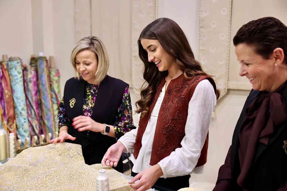La Fallera Mayor de Valencia, Carmen Prades, acudió al taller de la firma Hijas de Carmen Esteve para seleccionar las manteletas que lucirá en su espolín oficial. Durante el encuentro pudo examinar distintos diseños y valorar de primera mano el proceso artesanal con el que se elaboran estas piezas, optando finalmente por el juego que completará su primer gran conjunto de indumentaria.
