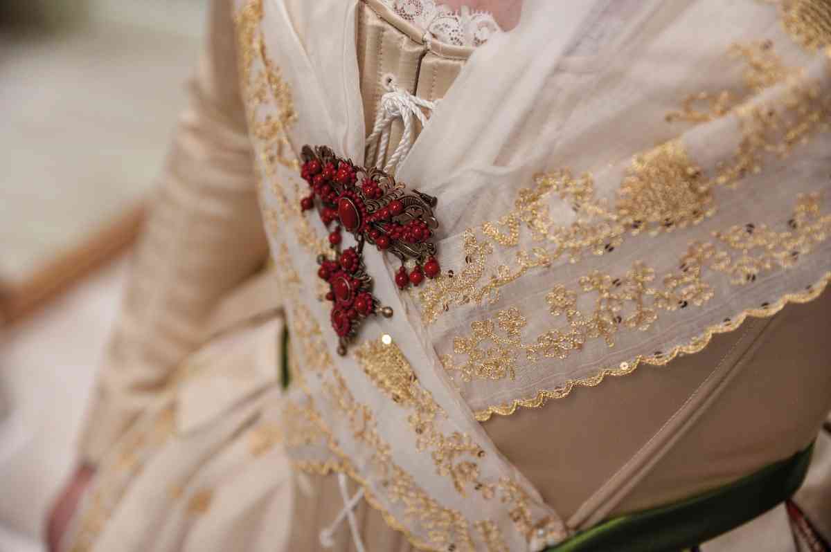 «Las manteletas se bordaron en cadeneta por artesanas sobre seda con representación de dibujos antiguos. Las puntillas estaban bordadas sobre tul con gran detalle y gran delicadeza. Y claro, el aderezo de joyería en acabado latonado con coral natural. El resultado: su enorme felicidad cada vez que lo admira. Porque no lo mira, lo admira con la felicidad de los sueños cumplidos».