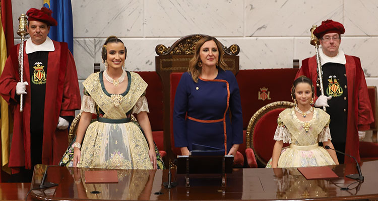 Tras ellas, Ada Fraj subió al escenario acompañada por el vicepresidente primero de la FJFS, Vicente Martín, y el alcalde de Faura, Toni Gaspar, que fue el encargado de ponerle la banda de Fallera Mayor Infantil. Su homóloga adulta, María Moliner, entró emocionada al Teatro Romano acompañada por el presidente de la FJFS, Enrique Javier Docón, y por el alcalde de Sagunto, Alfredo Castelló, que le impuso la banda en su última exaltación como presidente de la corporación municipal saguntina. María Moliner y Ada Fraj vistieron sedas de Vives y Marí para las telas de los trajes, confeccionados por Aguas de Marzo y Flor, la firma de Carmen Bueso, respectivamente.