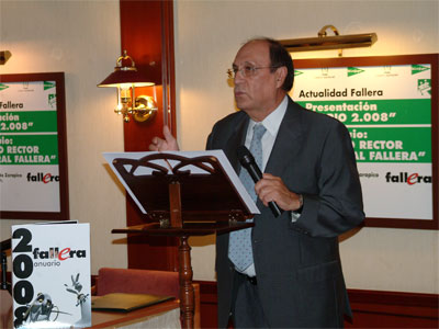 El director de la publicación, Braulio Torralba, fue el encargado de presentar el Anuario 2008, a la venta desde el pasado día 8 de septiembre. En su alocución destacó el trabajo de todo el equipo que hay detrás del volumen, así como el contenido que nutre las páginas de información fallera de esta edición.