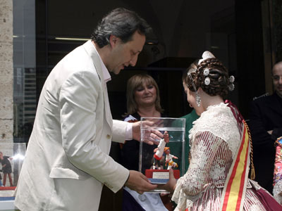 Eva Agulleiro recibió de manos de Félix Crespo un ejemplar del libro y una placa del Ayuntamiento de Valencia como símbolo del cariño y la admiración que el colectivo fallero profesará siempre hacia su padre, uno de los más importantes artistas falleros de las últimas décadas.