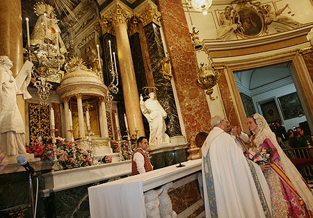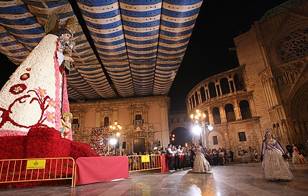 A continuación, y al son del Himno de la Coronación las trece pequeñas fueron entregando emocionadas sus ramos Juan Bautista Antón que los depositó a los pies de la Virgen de los Desamparados. El Himno de la Comunidad Valenciana y el Himno de España interpretados en la Plaza de la Virgen por la Banda Municipal ponían el punto final a esta primera jornada de la Ofrenda de Flores 2009.