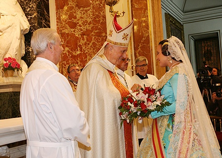 La ofrenda floral tuvo lugar dentro de la Basílica de la Virgen donde les esperaba el Cardenal Arzobispo de Valencia, Agustín García Gascó, que dio la bendición a los congregados en el templo de la Patrona de Valencia. La Fallera Mayor de Valencia y su Corte de Honor entregaron sus ramos a los pies de la Geperudeta mientras los presentes entonaban el "Himno de la Coronación".