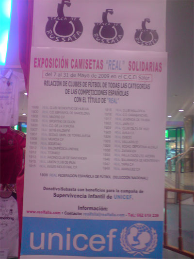 Desde el pasado mes de agosto, los componentes de esta activa comisión del barrio de Russafa han ido solicitando camisetas a diversos equipos de fútbol de 1ª, 2ª, 2ª B y 3ª división de la Liga Española, en concreto a todos aquellos que ostentan el título de Real. Y no sólo eso. El número de la camiseta es, en todos los casos, el mismo: el 24, que se corresponde con el número de censo de la comisión en Junta Central Fallera. Estas más de 20 camisetas están destinadas a la recaudación de fondos para UNICEF. Asimismo, esta actividad está enfocada dentro de los preparativos del 50 aniversario de la comisión infantil del colectivo, que tendrá lugar en 2011.