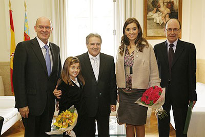 La segunda visita de la jornada llevó a Mª Pilar Giménez y a Ariadna Galán hasta el Palacio de Batlia, donde les esperaba el Presidente, Alfonso Rus. Durante este encuentro el presidente provincial trasladó su más sincera enhorabuena a las nuevas representantes falleras de la ciudad e hizo entrega a las Falleras Mayores, de una pieza de cerámica conmemorativa y de una insignia con el escudo de la corporación provincial.