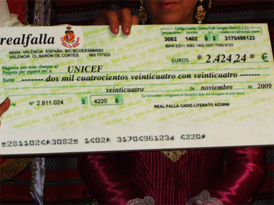 El martes 24 de noviembre, a las 20 horas y 24 minutos, tal y como estaba previsto, la Real Falla Cádiz-Literato Azorín, número 24 en el censo de la Junta Central Fallera, hizo entrega a UNICEF de un donativo por valor de 2.424,24 euros de la campaña "Camisetas Reales Solidarias", que recogió la presidenta de la entidad en la Comunidad Valenciana, Nidita Guerrero, y que irá destinado a la campaña para la supervivencia infantil.