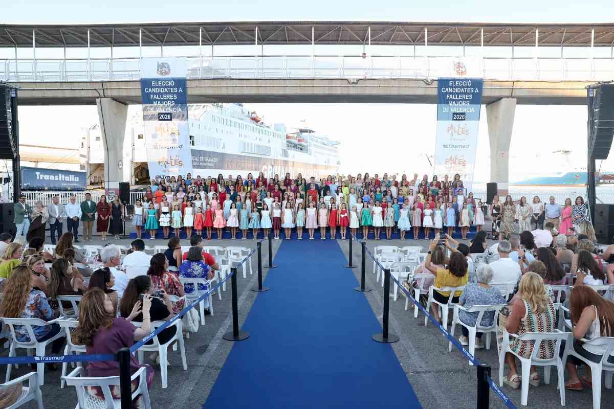 El exterior de la sede de la naviera española del Grupo Grimaldi ha sido el marco en el que han desfilado las 146 candidatas a Falleras Mayores de Valencia 2026 acompañadas por el aplauso de los asistentes al evento, que ha sido de libre acceso.