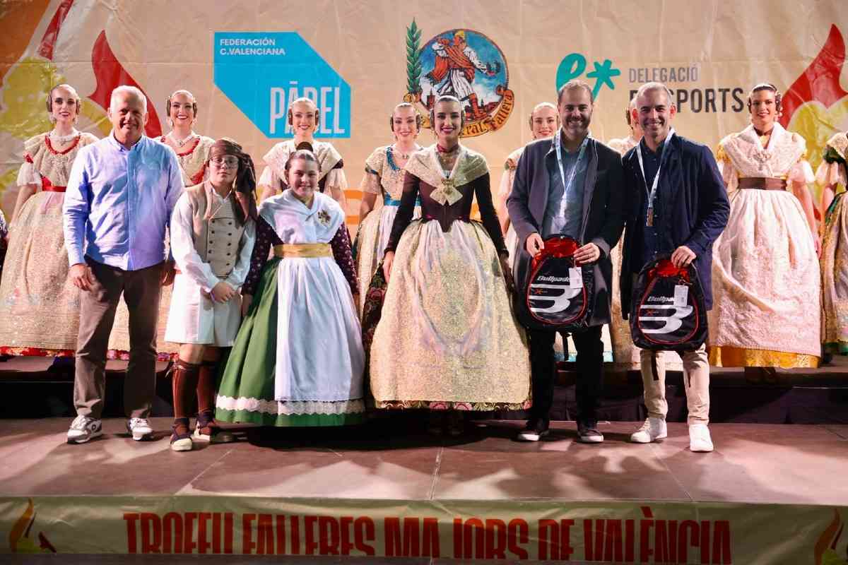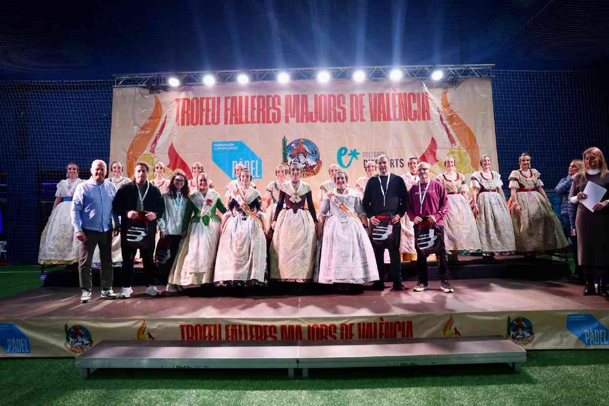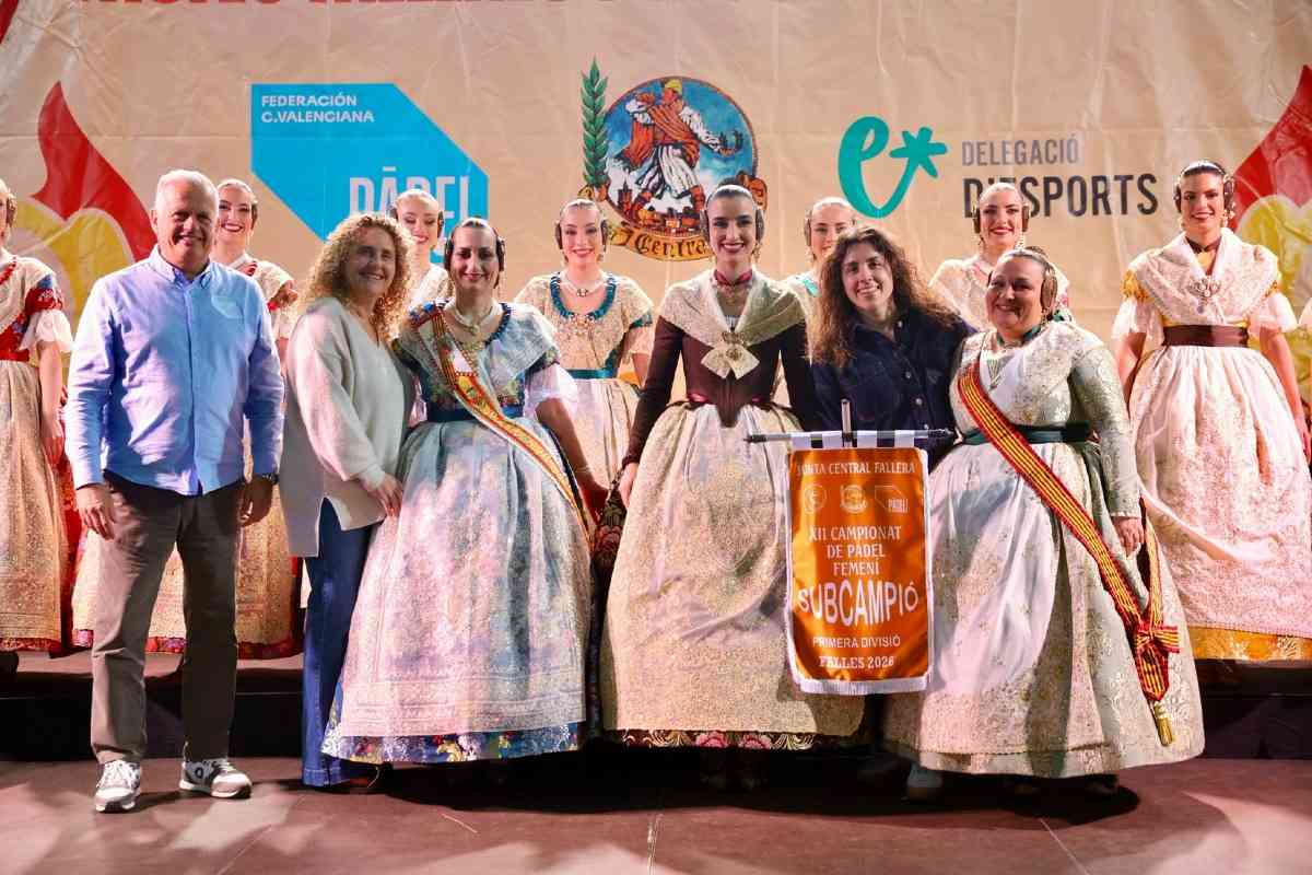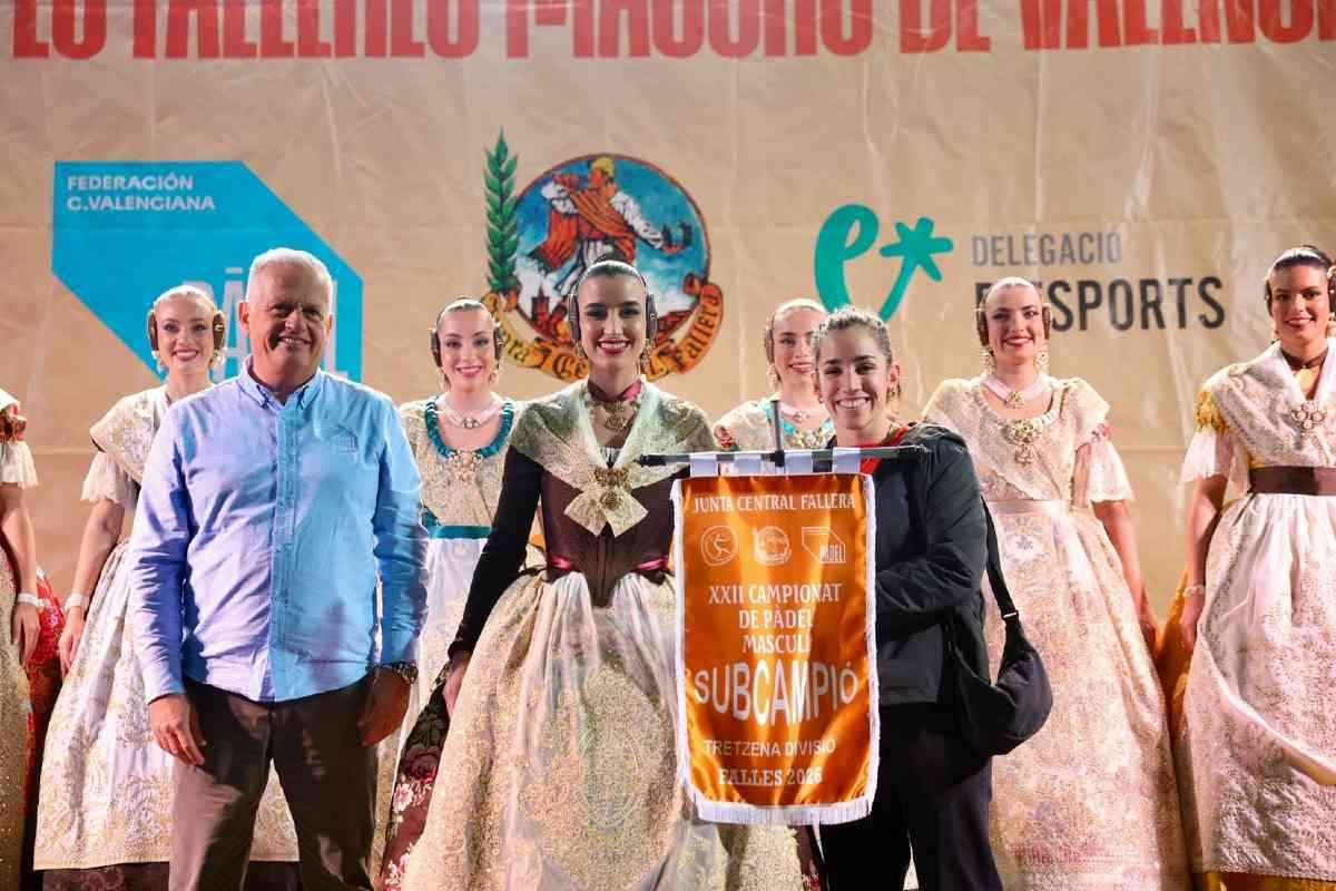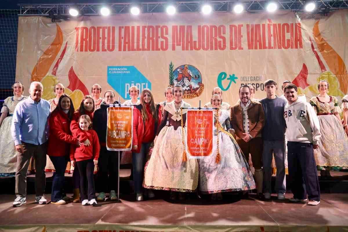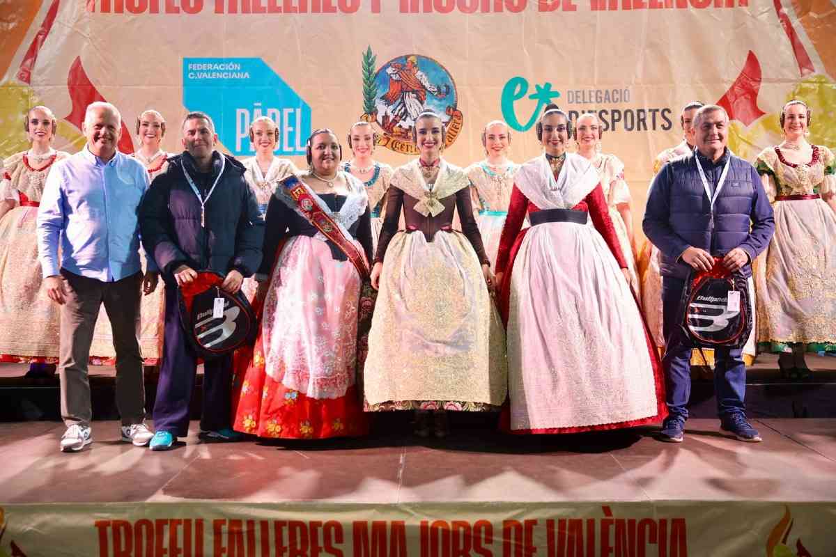 En el plano competitivo, la comisión de Convento Jerusalén-Matemático Marzal se alzó con la victoria en la categoría femenina, mientras que los jugadores de Ramiro de Maeztu-Humanista Furió hicieron lo propio en la masculina. La jornada culminó con la entrega de trofeos presidida por la Fallera Mayor de Valencia y su Corte de Honor, quienes repartieron los galardones a los representantes de las numerosas comisiones participantes en el campeonato de pádel fallero de este año.