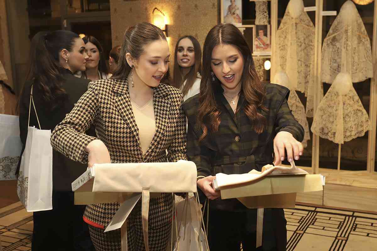 El Palacio de Santa Clara acogió la entrega oficial de las manteletas realizadas por Santos Textil para el segundo traje oficial de las Falleras Mayores de Valencia 2026, Carmen Prades Gil y Marta Mercader Roig, y sus Cortes de Honor, además de las puntillas que lucirán la Fallera Mayor y su Corte en toda la indumentaria oficial del ejercicio.