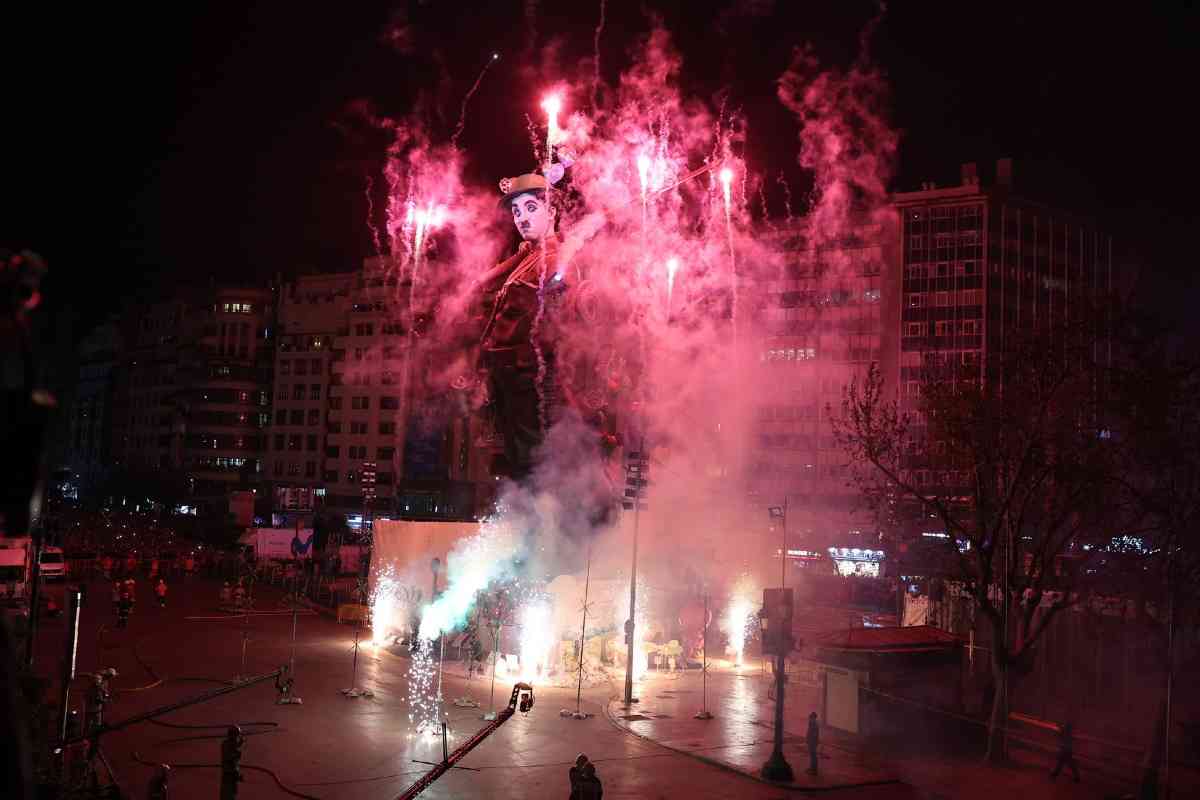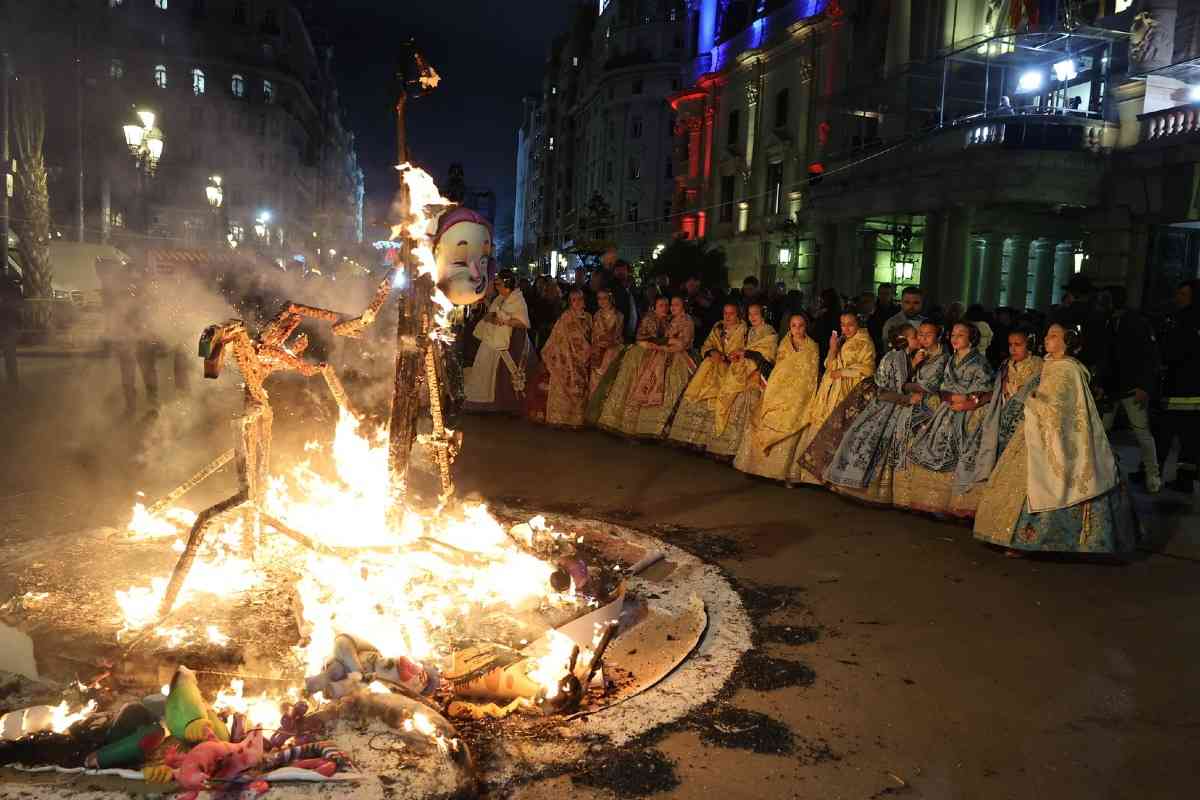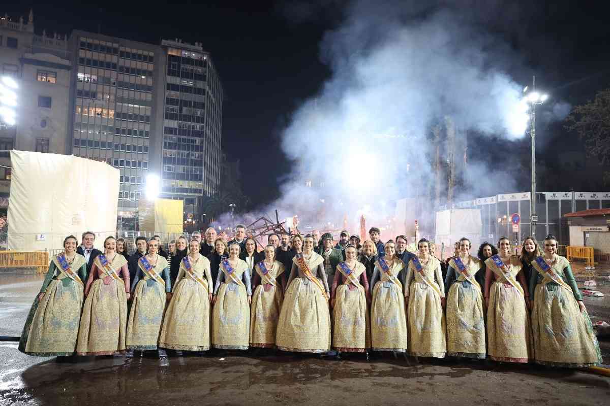 La última parada de la noche, como dicta la tradición, fue la plaza del Ayuntamiento. La Fallera Mayor de Valencia, Carmen Prades, y su Corte de Honor, contemplaron la cremà de la falla municipal, “Hope”, firmada por Alejandro Santaeulalia y Vicente Llácer. El enorme Chaplin desaparecía bajo las llamas simbolizando la renovación de la fiesta y dando la bienvenida al ejercicio 2027.