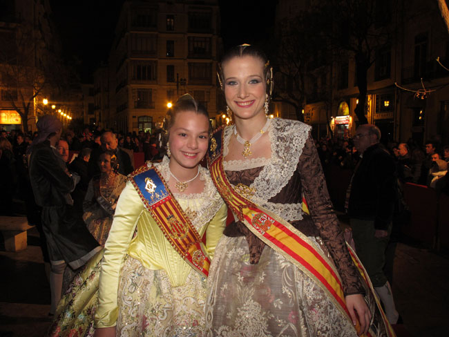 | La indumentarista Amparo Fabra vistió a las Falleras Mayores de Valencia en un día tan señalado. | En uno de los actos más importante de su reinado, Begoña Jiménez lució un traje confeccionado por Amparo Fabra, con un lampazo de Rafael Catalá, de nombre Jardines, en color marrón castaño tejido en sedas, oro blanco y colores. La tela del justillo es un damasco de seda brocado. Las manteletas son de Hijas de Carmen Esteve y las puntillas una pieza antigua manual de Valencie. El aderezo es de plata de ley chapado en oro mate, centros de piedra cabujón rodocosita, todo montado con hilos de perla natural, y terminado por purezas de perla, realizado por Art Antic. La Fallera Mayor Infantil de Valencia, Carla González, llevó un traje confeccionado por Amparo Fabra, reproducción del siglo XVIII, tejido en la fábrica de Vives y Marí, color amarillo citrino. El dibujo se denomina San Alejandro, de seda natural, que va complementado con unas manteletas de Hijas de Carmen Esteve y puntillas antiguas en el escote. El aderezo en plata de ley chapado en oro, con centros en piedra swarovski color topacio y collar con colgante y pulsera de perlas naturales de Art Antic y las peinetas realizadas por Flor d'Aigua. |