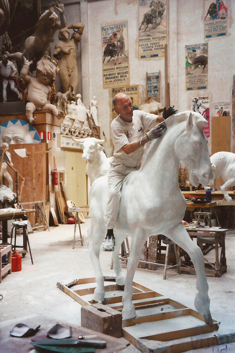 Desde entonces y hasta su jubilación en 2006 estuvo trabajando para una nómina de artistas tan larga como los treinta años de dedicación a las fallas. Comenzó con Santiago Rubio y Ginés, siguiendo con Manolo Ferrer, Salvador Guaita, Novel, Armando Serra, Juanjo García, Miguel Santaeulalia, Pedro Santaeulalia, Miguel Santaeulalia Jr., José Jiménez Baños, Agustín Villanueva, Emilio Miralles, Vicente Luna, Vicente Almela, Miguel Delegido, José Luis Platero, Ricky Alcaide, etc… Lo mismo monta y prepara stands de feria, instalaciones o expositores, que prepara y lija remates, centros y bases de fallas. Y sobre todo prepara ninots, miles de ninots. Algunos años llegó a preparar más de trescientos ninots. Su jornada laboral llegaba a las 14 horas y, no siendo un milenial, conoce a la perfección el 24/7.
