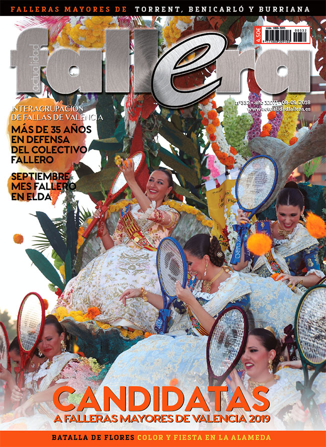 Las noticias más relevantes de las últimas semanas forman parte del contenido de una revista que hace balance de los 35 años de la Interagrupación de Fallas de Valencia a través de un interesante reportaje. Asimismo, las preselecciones y las candidatas a Falleras Mayores de Valencia; la Batalla de Flores; la festividad de la Virgen del Carmen; la elección de las Falleras Mayores de Torrent, Benicarló y Burriana; los premios de las hogueras de Sant Vicent del Raspeig; la elección de las Falleras Mayores y los bocetos de las Fallas de Elda; la sección ‘Los pilares de la fiesta’, en esta ocasión dedicada a Miguel Galán, y nuestro espacio reservado para la elegancia y la tradición forman parte del número.