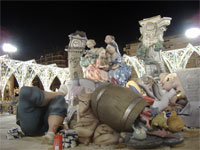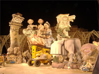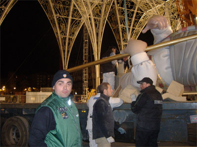Justamente el día de la inauguración de las luces, encontramos a Pedro Santaeulalia y su equipo descargando uno de sus camiones, ya que debido al viento no han podio continuar levantando falla. "Con este viento- nos decía Pedro- nos ha sido imposible seguir subiendo figuras, incluso esta mañana hemos temido que algunos de los arcos de luz se viniera abajo ya que el viento soplaba de una forma impresionante. Pero ha habido suerte y ya pasó el vendaval. Según tus compañeros de Canal 9, esta noche amainará totalmente y mañana tendremos un buen día para montar".