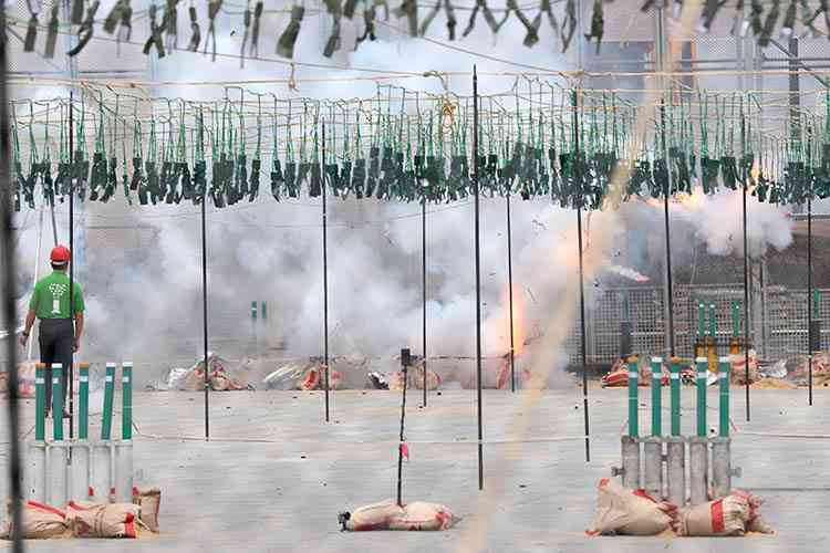 La pirotecnia Crespo de Alzira homenajea a la Guardia Civil en un disparo de truenos dobles y dos alturas.