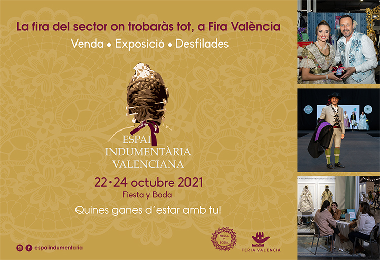 Espai Indumentària Valenciana cuenta con más de 60 firmas confirmadas para la tercera edición que tendrá lugar del 22 al 24 de octubre en el marco de Fiesta y Boda de Feria Valencia. El escaparate lo conforma las firmas A L'Antiga, Academia El Tabalet, Actualidad Fallera, Aguas de Marzo, Agustín y Amaia Orfebres, Alan Indumentaria, Albaes, Álvaro Moliner, Ambient Faller, Amparo Gálvez, Andrea Indumentaria, Angelita Suay, Arrels Indumentària, Art Antic Joieria, Art&Moño, Artesanía Fidela, Artesanía Ortiz, Arturo Torremocha Indumentaria, ASCIVA, Belmar Fotógrafos, Blusones Coco-Liso, Brocat Isabel Leiva, CanCan en Pac - El Revollet de L'Ou, Carlos Salvador Indumentaria, Centro Artesanía Comunitat Valenciana, Colección Herencias, Daniel Bada, Diario de Una Peineta - La Peineta Shop, El Mundo de Aran, El Vestidor Faller, Empar del Remei, Escola Cànem, Fil D'Or Indumentaria Valenciana, Gemali, Gremio Artesano de Sastres y Modistas CV, Hijas de Carmen Esteve, Indumentaria Valenciana Pilar Valverde, La Calandria · Roba Tradicional i Antiga, La Casa de los Falleros, La Llar del Fil, L'Agulla D'Or, L'Armari de Fallera, L'Atelier de la Seda Textil Editores, L'U i Dos Indumentaria Valenciana, Mamá Cose, Marga Noguera, Margarita Vercher Cancanes y Enaguas, Marian Indumentaria, Martí Indumentaria, Ma-Vi-Mar, Máximo Betro, Maycom Atelier, Mercería Rosa Tomás, Més Q Pintes, Nines de Cotó, Orfebres Peris Roca, Pearls Before Roses, Pinazo y Burlay Indumentaria Valenciana, Pitichú, Realce, Roa Indumentaria, Santamaría Orfebres, Segles Indumentaria Valenciana, Sendra Tradició i Indumentària, Sergio Esteve Essència Valenciana, Valentia y 25 Alfileres.