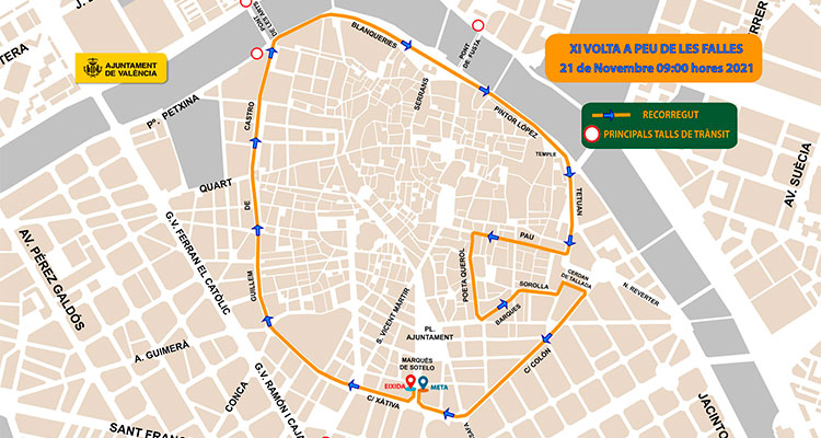 Las y los participantes dispondrán de una hora para completar el recorrido que discurrirá por las calles Xàtiva, Guillem de Castro, Blanqueries, Conde de Trénor, Pintor López, la plaza de Tetuán, las calles General Tovar, la Pau, Marqués de Dos Aguas, Poeta Querol, Pintor Sorolla, la plaza de Alfonso el Magnánimo, y las calles Cerdán de Tallada, Colón, Xàtiva, para finalizar en la de Marqués de Sotelo.
