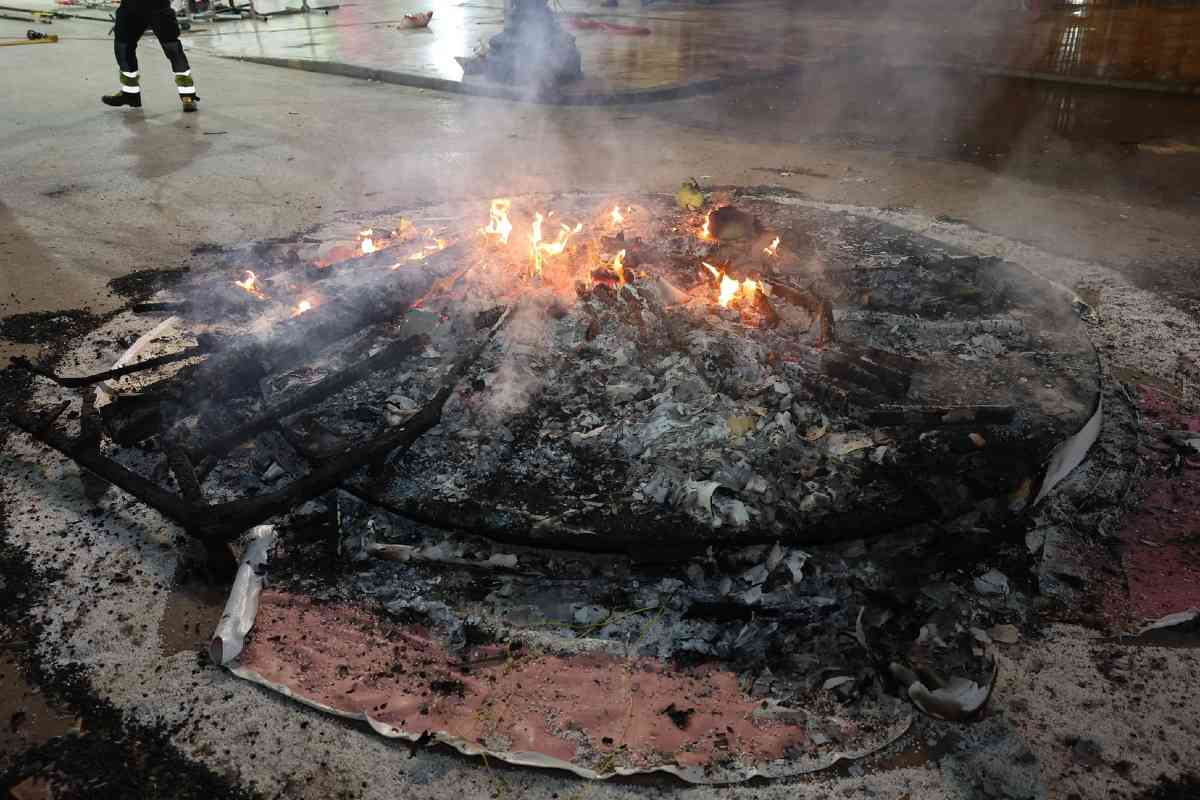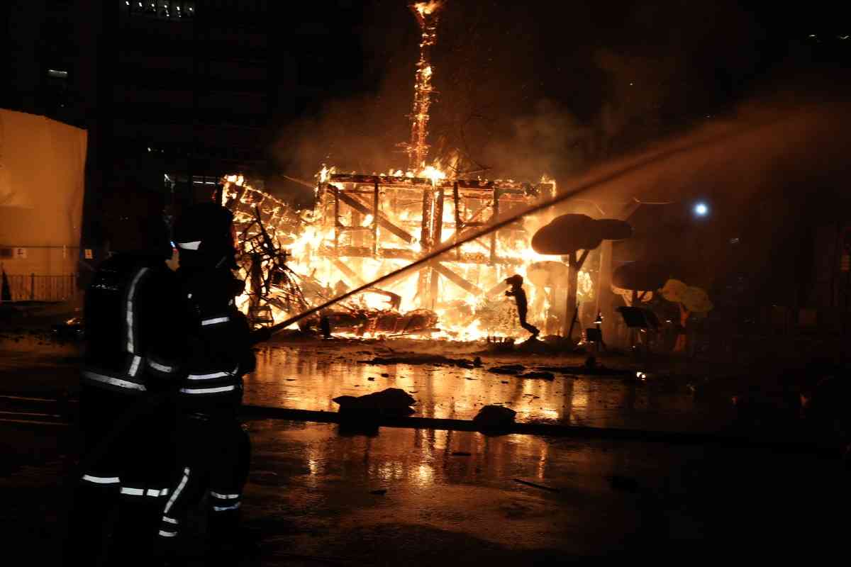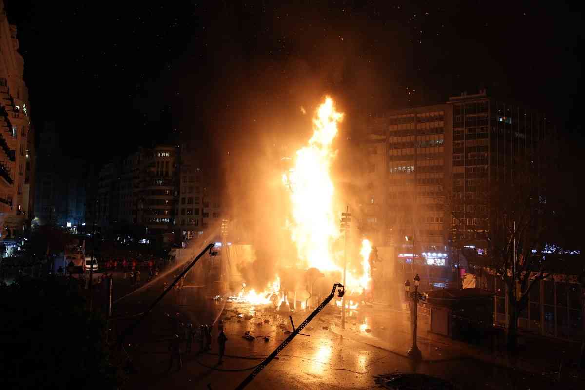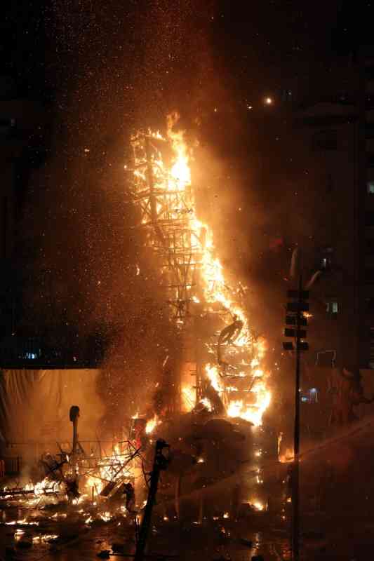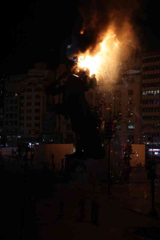 A las 22:00 horas, el fuego se extendió a las fallas grandes de la capital. El mapa del fuego tuvo su punto álgido en el sector de Especial, donde ardió la falla campeona de 2026, Convento Jerusalén, un imponente proyecto de David Sánchez Llongo.