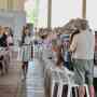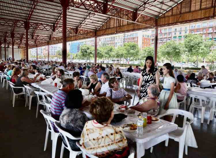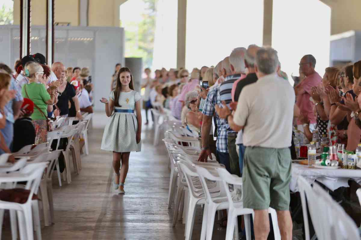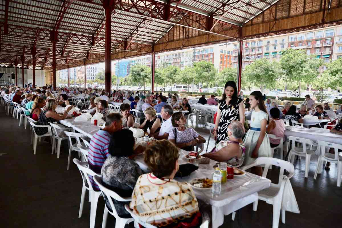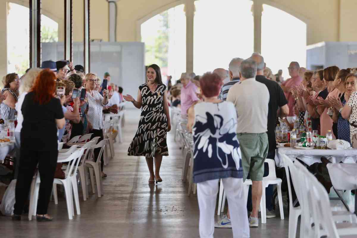 Este acto no pudo celebrarse en marzo debido a la lluvia y se ha recuperado ahora coincidiendo con la llegada del buen tiempo. Las Falleras Mayores de Valencia han saludado y conversado con las personas mayores que han asistido al encuentro, y han compartido con los asistentes una paella gigante.