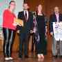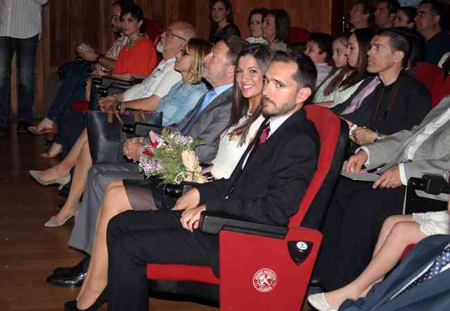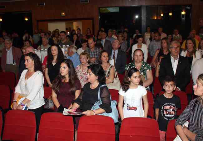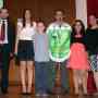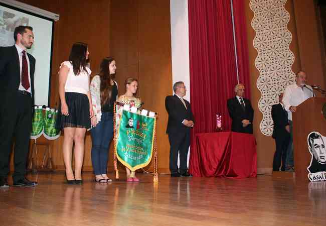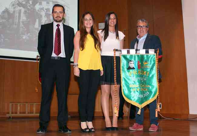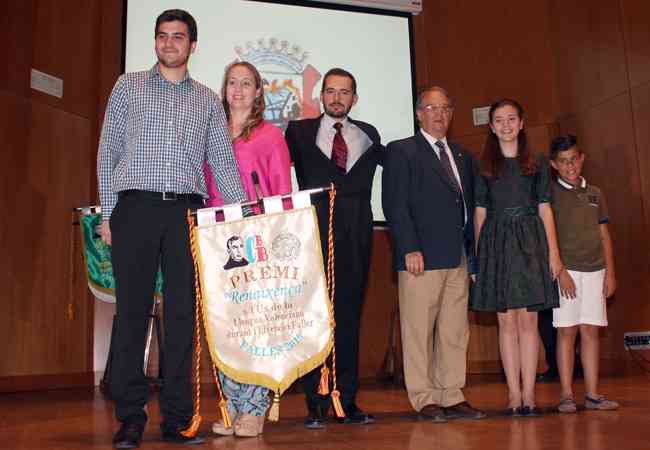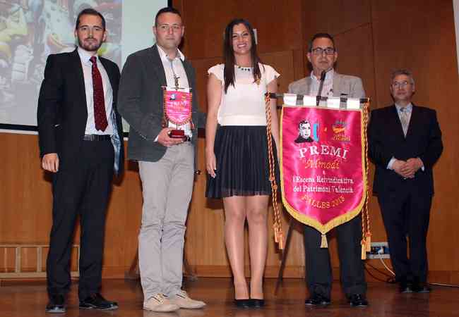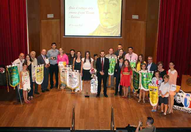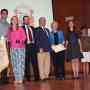 Foto de familia de los galardonados con los premios "El Mòle" "Renaixença" "A la millor dicció en el concurs de teatre en llengua valenciana" "Garrofa" y "Almodí" junto a la Fallera Mayor de Valencia 2015 y el presidente del Casal Bernat i Baldoví
