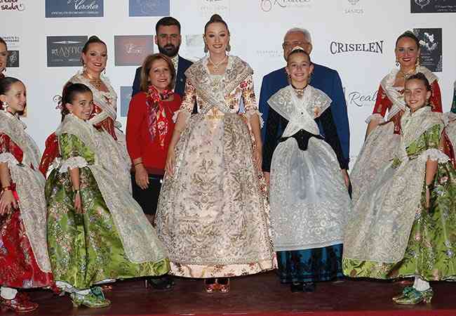 Foto de los indumentaristas oficiales con las Falleras Mayores de 2018 y sus cortes de honor