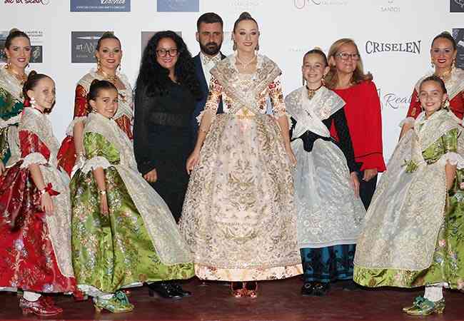 Foto de los indumentaristas oficiales con las Falleras Mayores de 2018 y sus cortes de honor