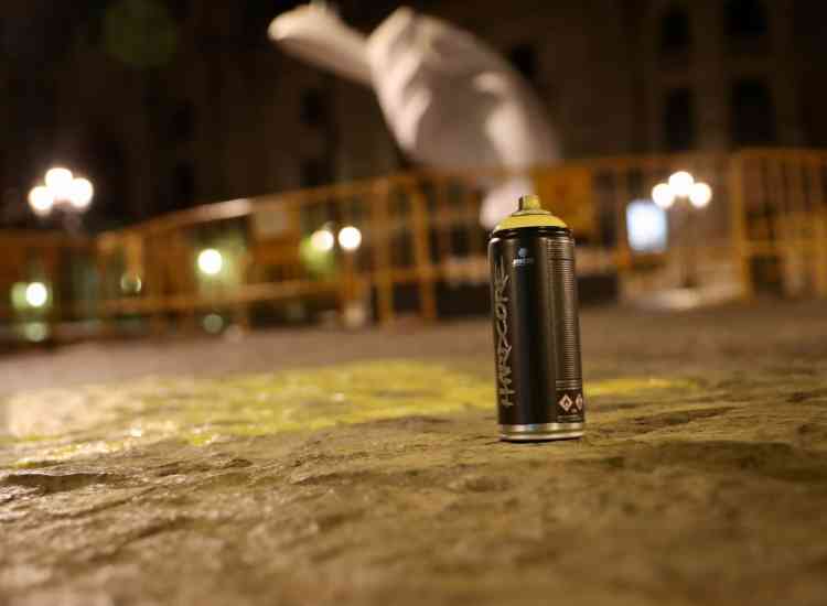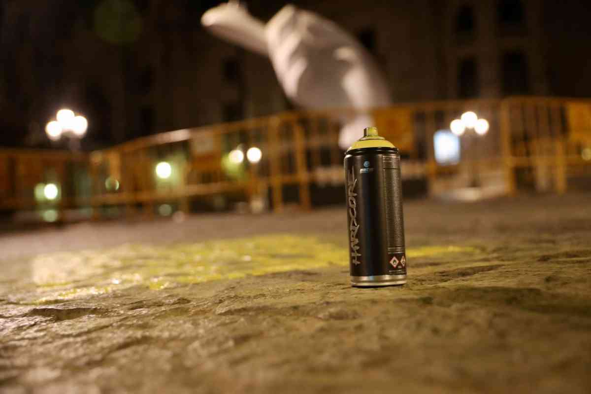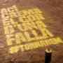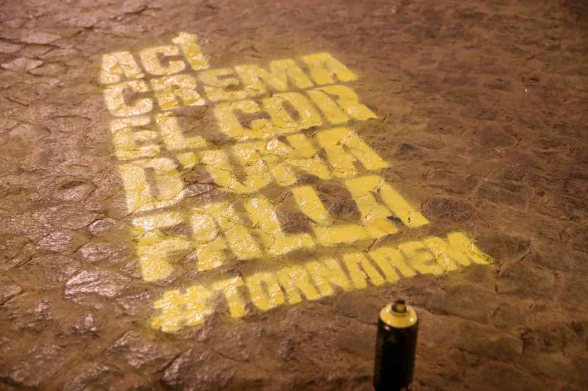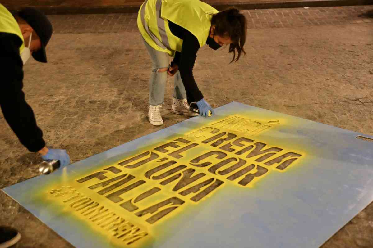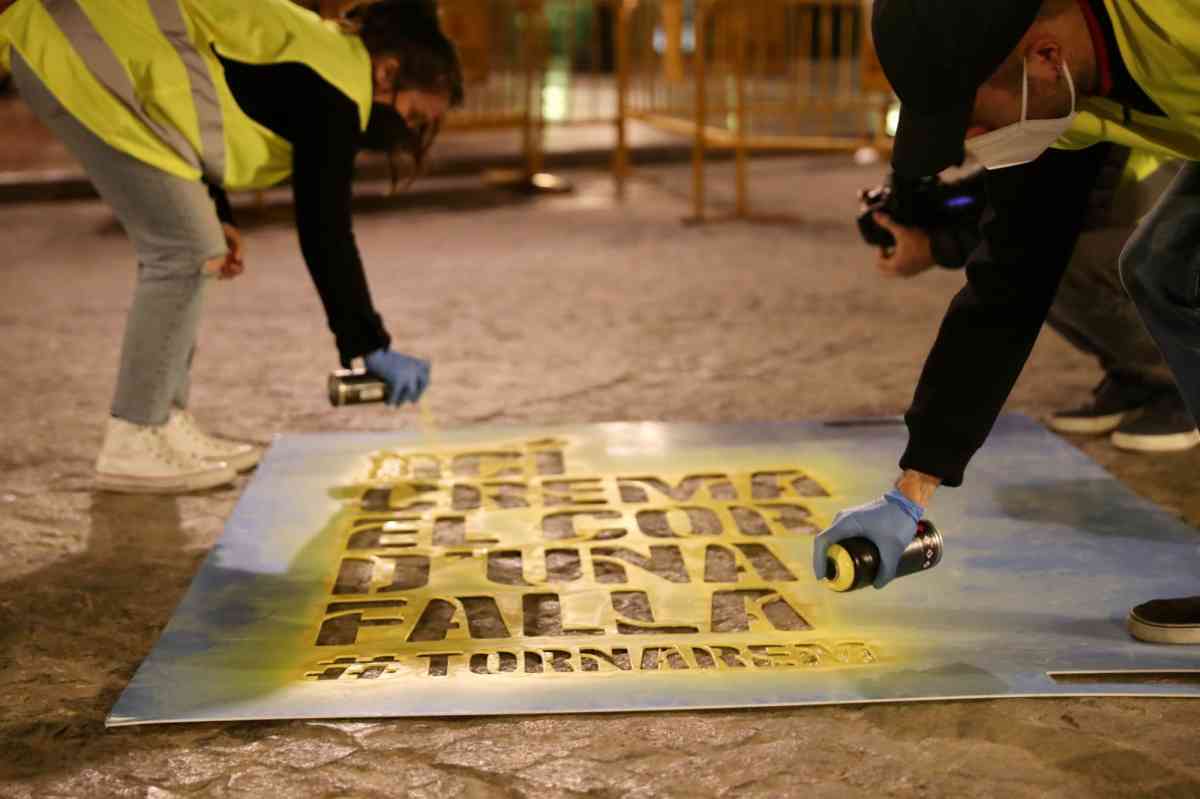 'Ací crema el cor de una falla' ha sido la frase que, de madrugada, se ha pintado dentro una acción promovida por la JCF en un mes de marzo sin fallas por causa de la pandemia. Junto a la frase destaca la etiqueta #Tornarem