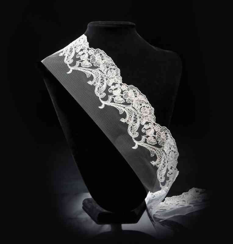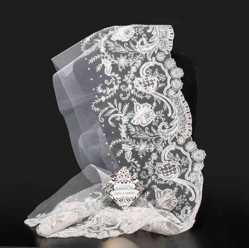 Para Rocío Gil Uncio, Fallera Mayor de Valencia, Miriam Santos afirma que se han inspirado “en un dibujo muy antiguo de nuestro archivo para poder realizar esta pieza exclusiva caracterizado por pequeñas flores que suben y descienden entre los filamentos y tallos obteniendo así un resultado más que delicado”. La puntilla tiene un ancho de 21 cm y está bordada sobre tul de algodón con un hilo especial muy delicado para dar forma a los pequeños detalles del dibujo.