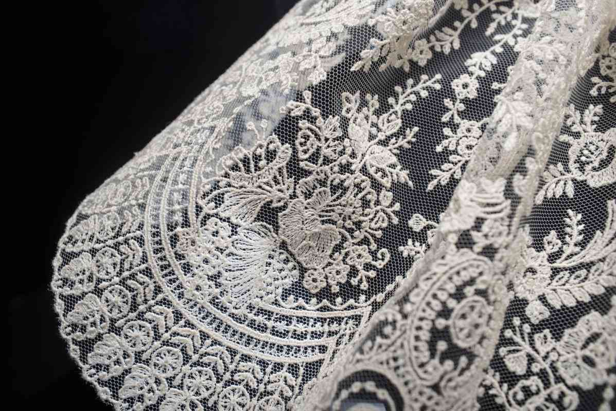 En el caso de Daniela Goméz, y también en su primer traje oficial, el ancho de la puntilla es de 16 cm. “El diseño parte de un encaje antiguo de aguja de Bruselas con rosas dobles. Bordada a mano color Ivoire, con ‘point de rose’ que superpone un doble pétalo que le da realce. Además, se han incorporado, también a mano, aplicaciones en seda rústica con motivos de hojas y centros y con bordado en filtire en las ondas que le da un donaire especial”, afirma Miriam. En el segundo traje oficial, luce unas puntillas bordadas en algodón mercerizado con dos hilos en diferente tono de color ivoire para realzar y dar un efecto de relieve.