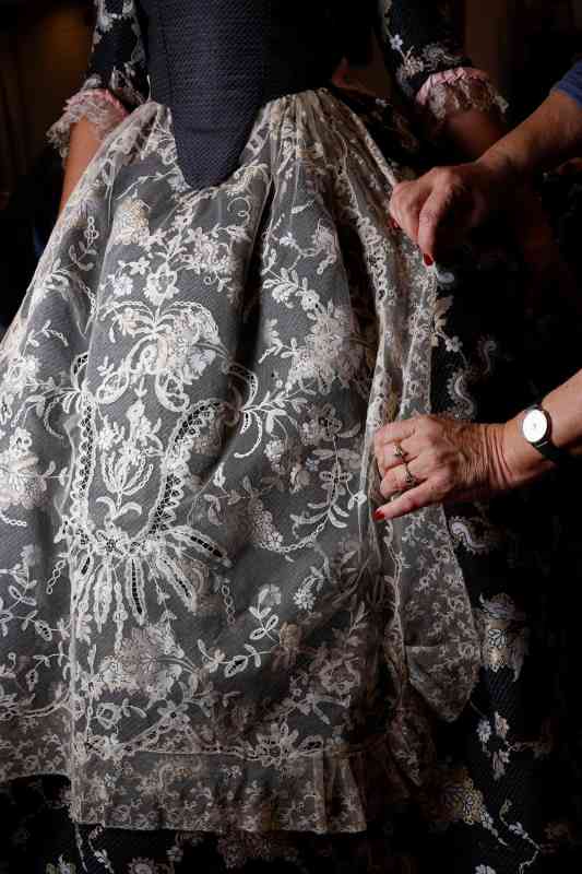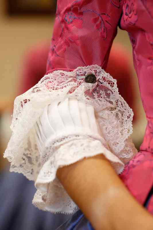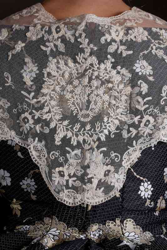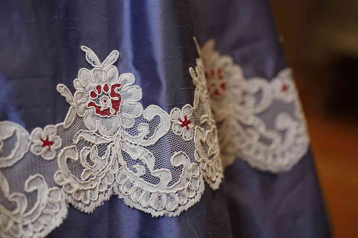 En este reportaje vemos una seda de color azul con incrustaciones de encaje de guipur y bordada, así como un cuerpo en color coral y azul. Camisa de puño plisado con encaje. Asimismo, la firma nos muestra una seda negra que combina el oro y el blanco, integrando un modelo en el que destacan unas delicadas puntillas antiguas que resaltan en el conjunto.
