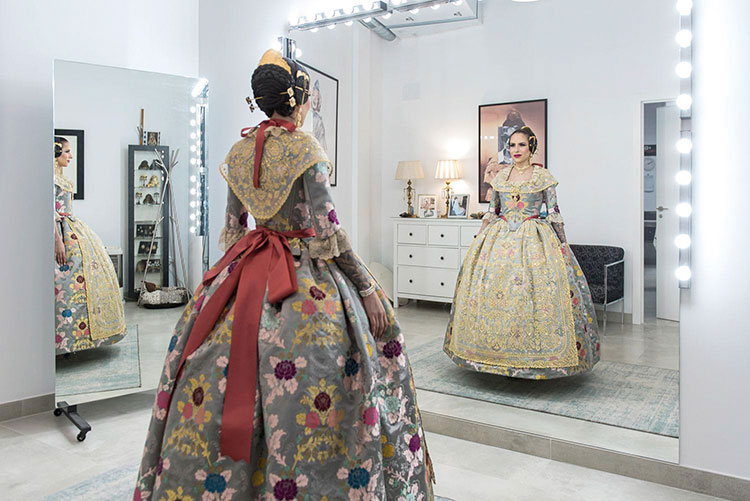 Buscando lo genuino encontramos este modelo de la firma Flor de Cotó que sigue las líneas del XVIII recuperando un dibujo clásico de espolín de un cartonaje antiguo llamado Soria, realizado por Compañía Valenciana de la Seda. Hay que destacar que, a la hora de escoger los colores de un espolín, el cliente recibe el asesoramiento de Flor de Cotó. Lució el traje en su presentación Almudena Romero Prats, fallera mayor de Serrans-Plaça dels Furs, que lleva peineta y aderezo en plata de primera ley sobredorada realizados por el Taller Flor d’Aigua.