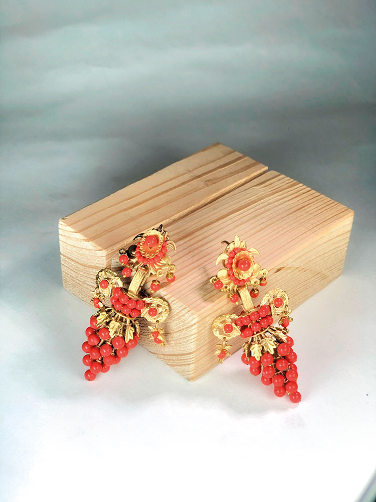 Elisa Peris, de Peris Roca, nos muestra unos pendientes de racimo de uva realizados con coral rojo cerdeña, elemento natural que ha sido ampliamente utilizado en la joyería tradicional valenciana. El origen marino de este elemento debe su nombre a la isla de Cerdeña.