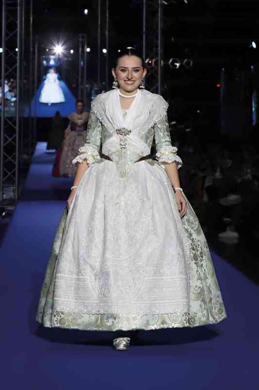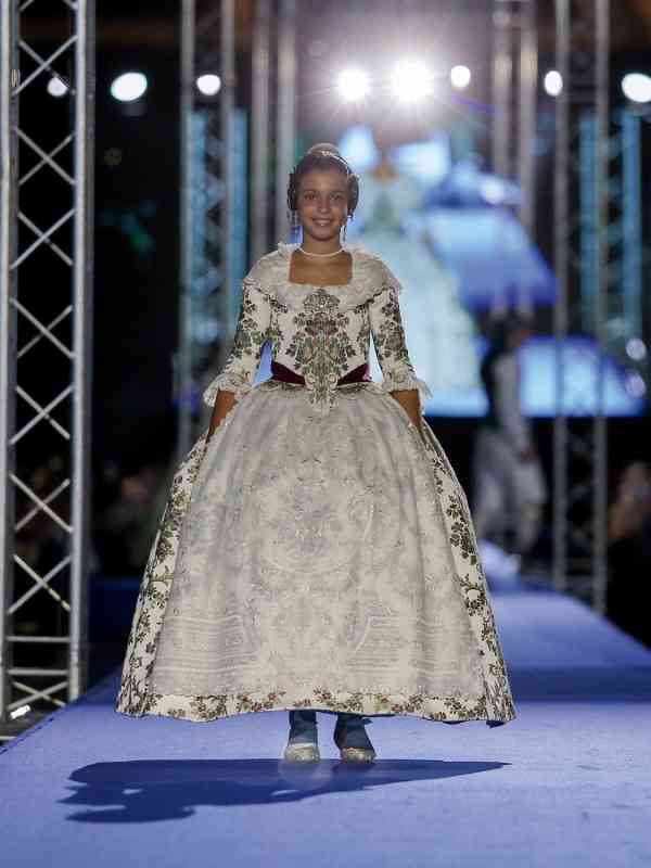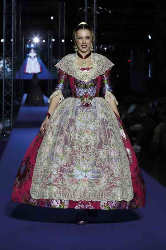 - Carla Palomares participó con la seda Santa Rufina de Vives y Marí en borgoña, confeccionada al estilo del s. XVIII, con manteletas doradas y seda rayada de Artesanías Valencia