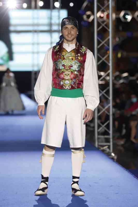 - Borja Vives desfiló con un traje de saragüell donde destaca el chaleco confeccionado con la seda A Coruña en borgoña.