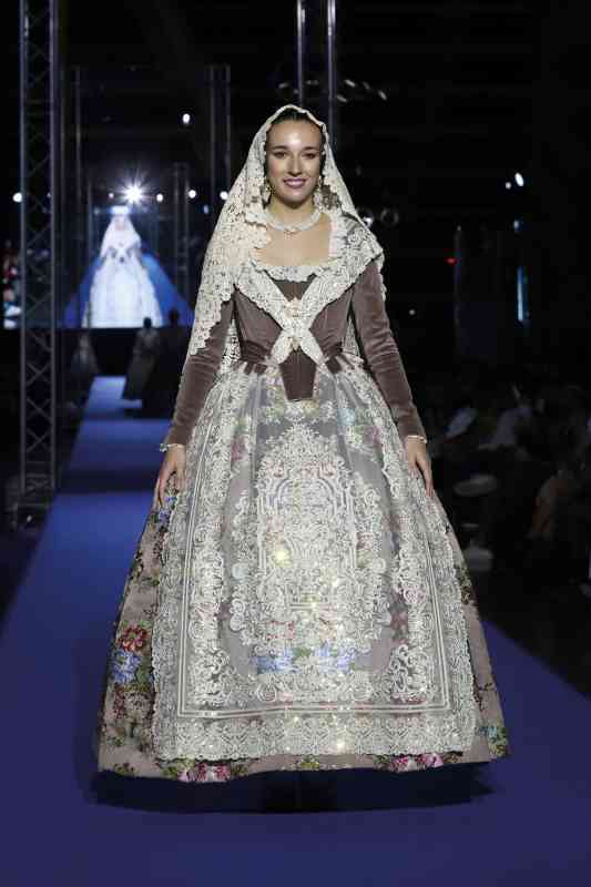 - Anabel Esparza viste la seda Abastos, exclusiva de Álvaro Moliner y fabricada por Vives y Marí, en color castor con corpiño de manga larga y manteletas de Hijas de Carmen Esteve. Complementa el traje con una mantilla de puntilla estilo punto duquesa de la firma Adriluc.