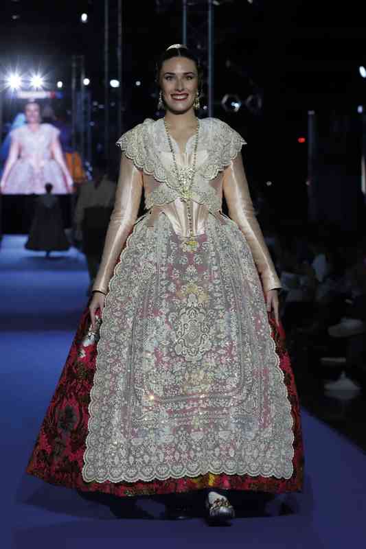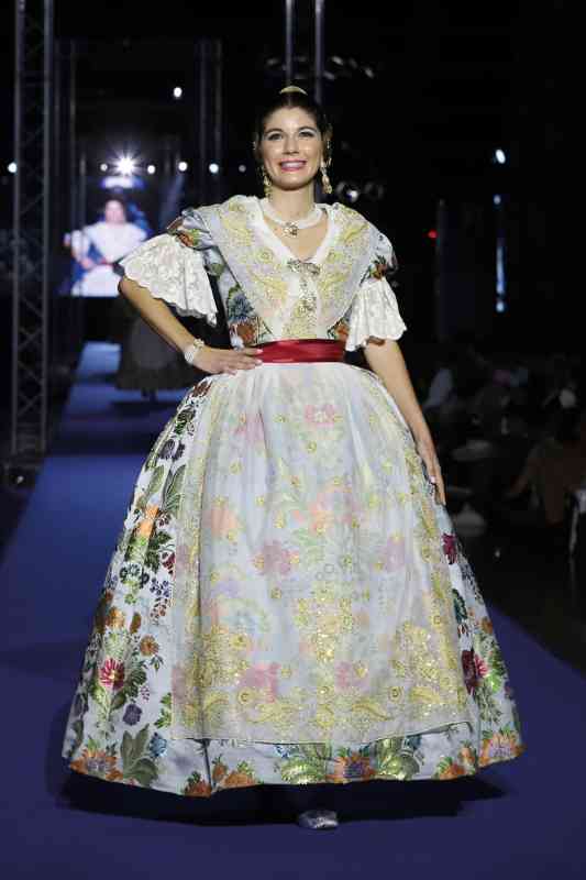 - Carmen Torres llevaba un brocatel semimanual en seda grana espolinado en colores, complementado con un jubón rosa de seda con las mangas adornadas con pasamanerías valencianas al tono. El pañuelo y delantal, en este caso, de tul bordados a cadeneta con hilo de oro y lentejuelas.