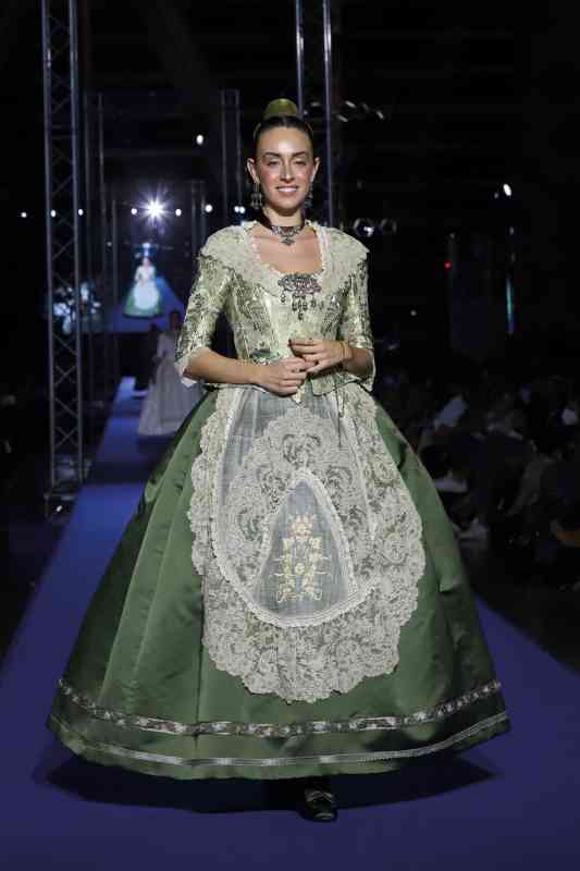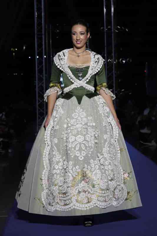 - Marina Gaspar, fallera mayor 2022 de la falla Exposición, desfiló con un traje del siglo XVIII realizado en seda natural con un dibujo de cenefa inspirado en el palacio de Versalles. El corpiño se combina con una seda en verde picea de manga semi con puntillas de encaje de punto de aguja. Manteletas de tul bobiné bordada artesanalmente en color blanco roto y lentejuelas oro.