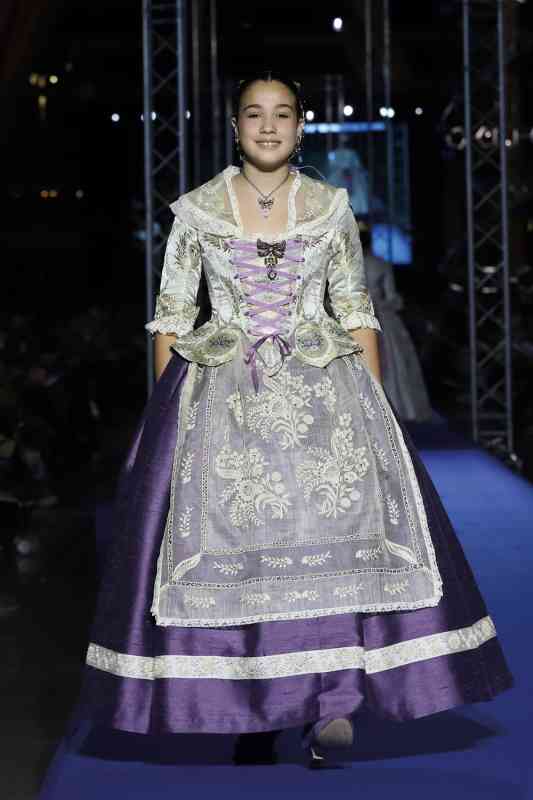 - Eva Gaspar, fallera mayor infantil 2022 de la falla Exposición, lució un traje con falda lisa de lino y seda adornada con una cenefa floral y corpiño de manga semi, también en seda, de fondo crudo con un precioso dibujo combinado en varios tonos de malva. Manteletas de nipi, bordado artesanal y puntillas de valencié.