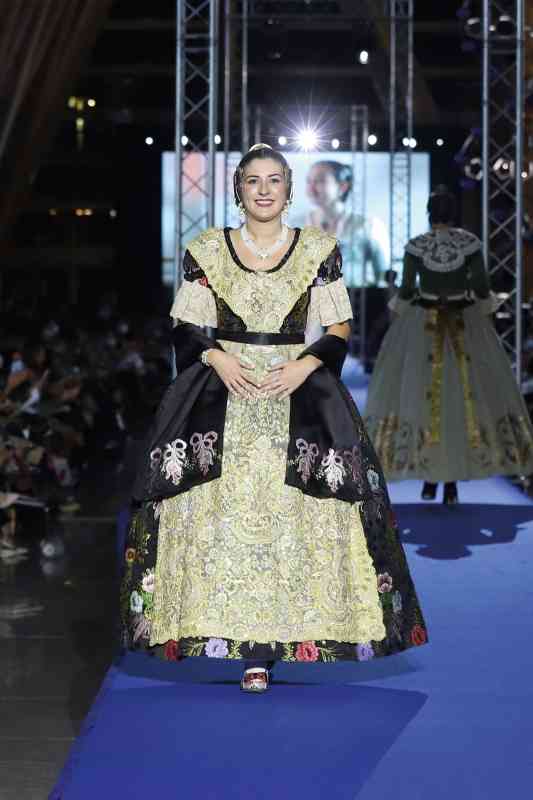 - Carla García, fallera mayor de la falla Lope de Vega en 2019, llevó un espolín en color negro y espectacular colorido, modelo Lidón, con manteletas de seda bordadas en realce en oro y crudo. Como complemento perfecto, lució un chal de espolín modelo Glicina.