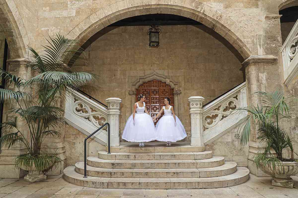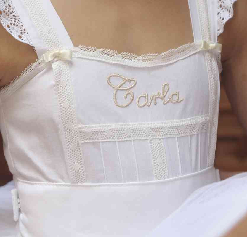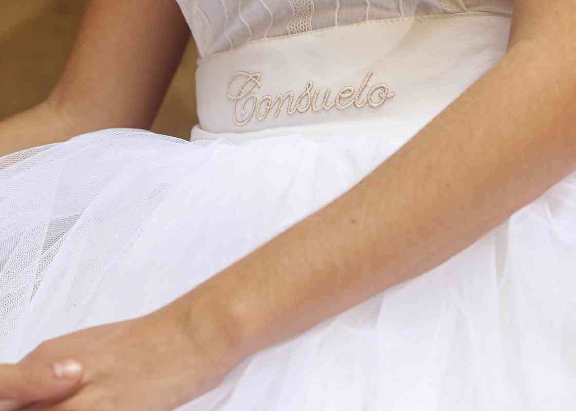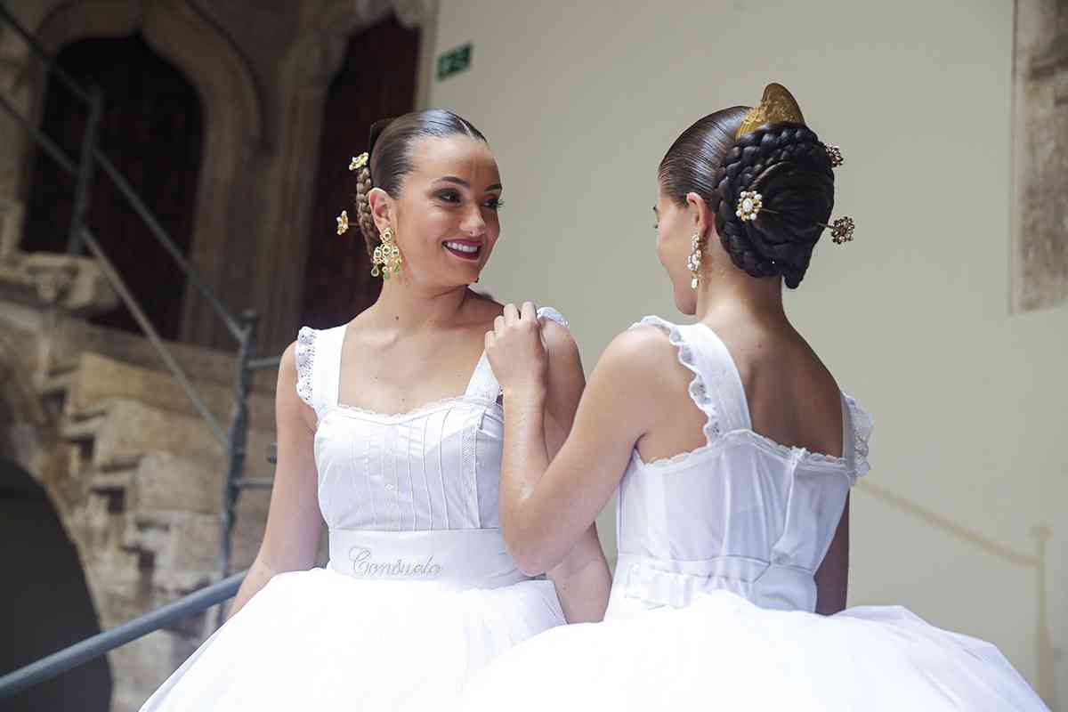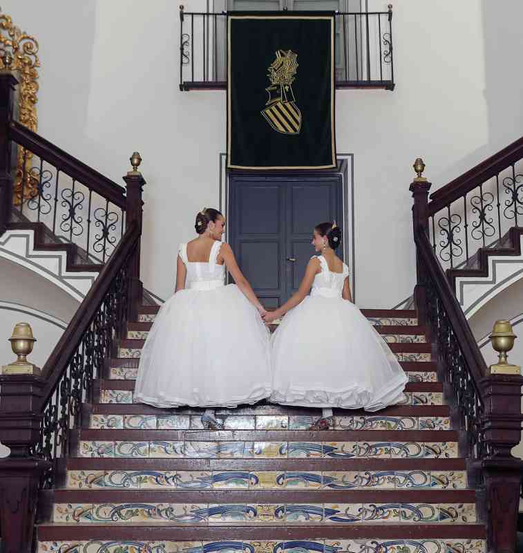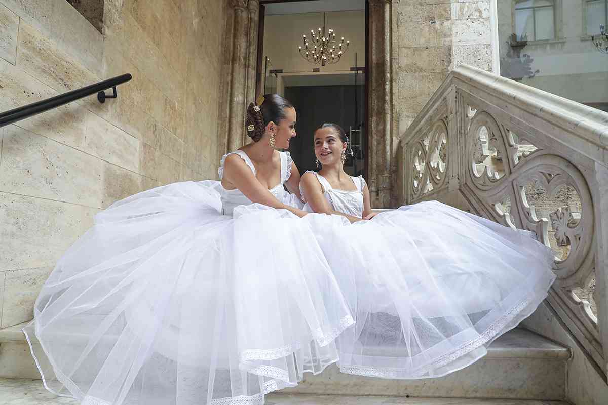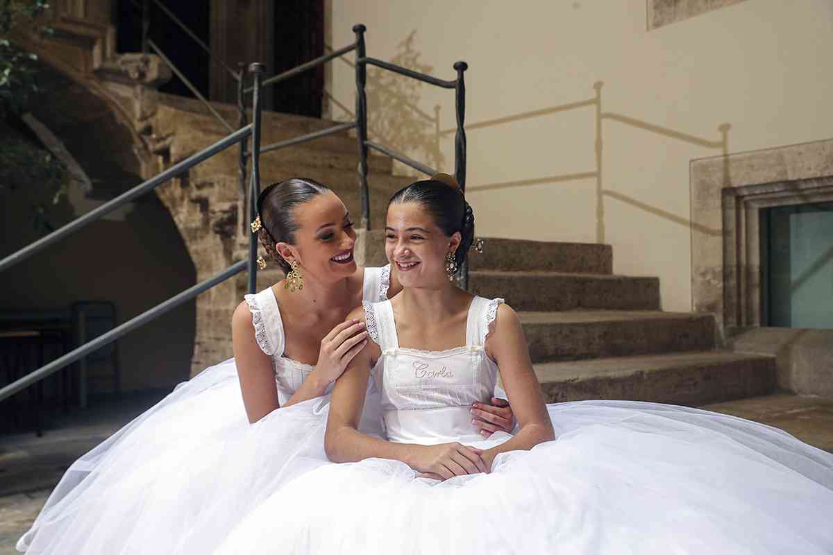 Consuelo y Carla lucen el Alçaor Modelo FMV personalizado con el detalle de sus nombres bordados en las cinturillas. Se trata de un cancán que ha revolucionado la indumentaria valenciana con su innovadora forma de ahuecar con cilindros flexibles sin utilizar materiales rígidos, consiguiendo ligereza y aportando un vuelo natural a las faldas.