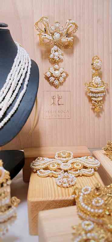 Si hablamos de las colecciones que nos presenta Peris Roca, el trabajo de diseño y construcción de las piezas con perlas es tremendamente laborioso, ya que, para realizar la decoración y los adornos deben ser ensartadas una a una, conformando pinjantes, orlas, cintas e hileras de minúsculas perlas. “Es apasionante observar cómo va cambiando la pieza a medida que se va vistiendo con ellas”, confiesa Elisa.
