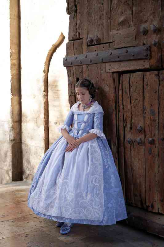 De entre los muchos trajes que Eugenia Puertes ha confeccionado para Ana, destaca el de la proclamación, con una falda de seda y un corpiño hecho con la primera falda de valenciana de su madre. También el traje de fallera mayor infantil, donde el papel de Ana fue fundamental. Se trata de una seda aguamarina que encandiló a Ana, quien junto con el apoyo de Eduardo convenció a la madre, dando como resultado un traje perfecto.