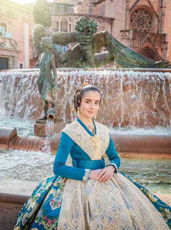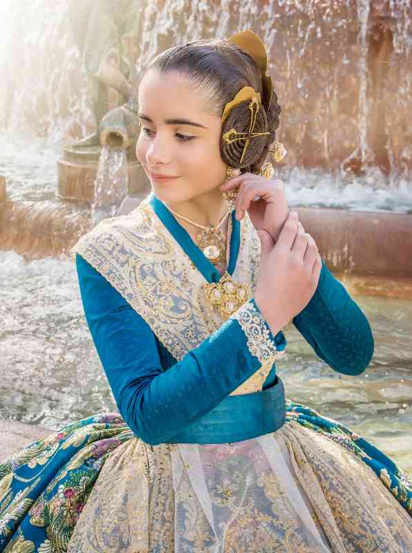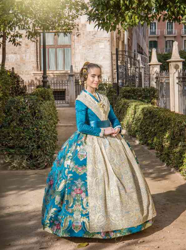 Hortensia Santiago, responsable de la firma de indumentaria, nos explica que «para estas Fallas eligió una seda estrecha en tono de fondo azul magia con 15 colores de trama más el oro como metal. El dibujo, de nombre San David, es idóneo, por su riqueza y estructura, para la confección de un traje del siglo XIX». En estas páginas vemos a Belén lucirlo con jubón de manga larga. «Las manteletas son de tul de algodón, posicionadas en pico y con cinta suelta que se agarra a la joia como se colocaba antaño. La cinta en cintura está trabajada en tablas de a tres», indica Hortensia.