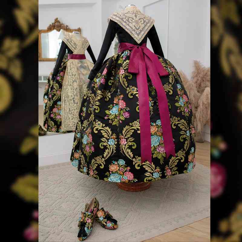 Para el homenaje de las Fuerzas Armadas, Marina García vistió un traje compuesto por un Santa Lucía en fondo negro tejido por Compañía Valenciana de la Seda.