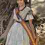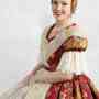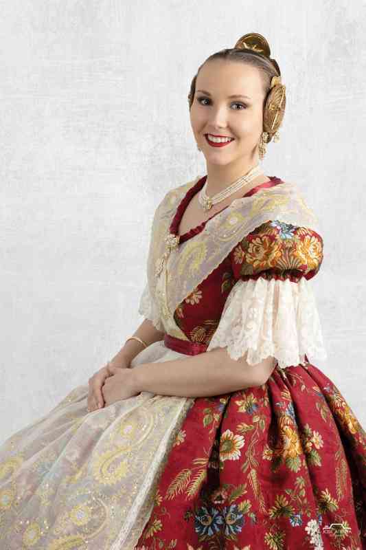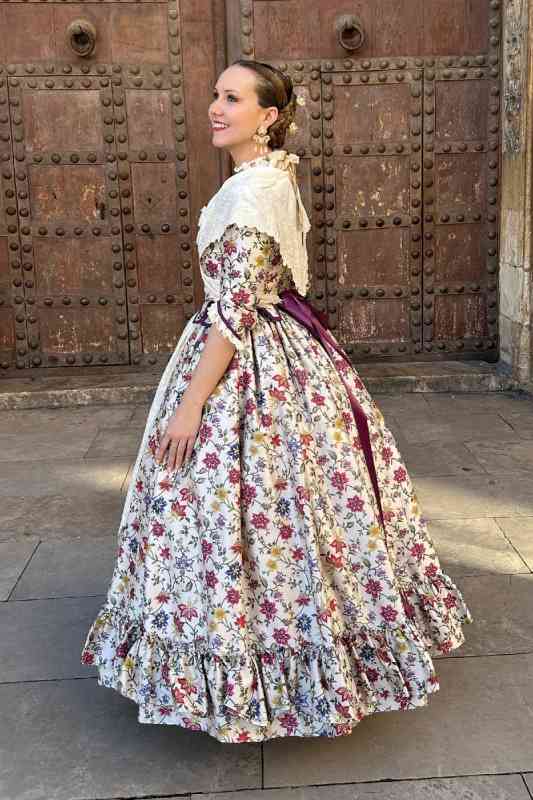 Lampas de seda color cereza modelo Virgen de Vallivana tejido por Compañía Valenciana de la Seda, confeccionado con patrones del siglo XIX. Mocador de pit y delantal en muselina bordada en cadeneta con un dibujo de palmas y filtirés en oro guarnecido con lentejuelas, muy acorde con el estilo del traje.