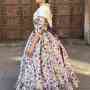 Adriana viste un damasco azul y blanco, dibujo inspiración de la época, confeccionado con patronajes del siglo XIX. Mocador de pit y delantal en muselina bordadas en crudo con lentejuelas doradas.