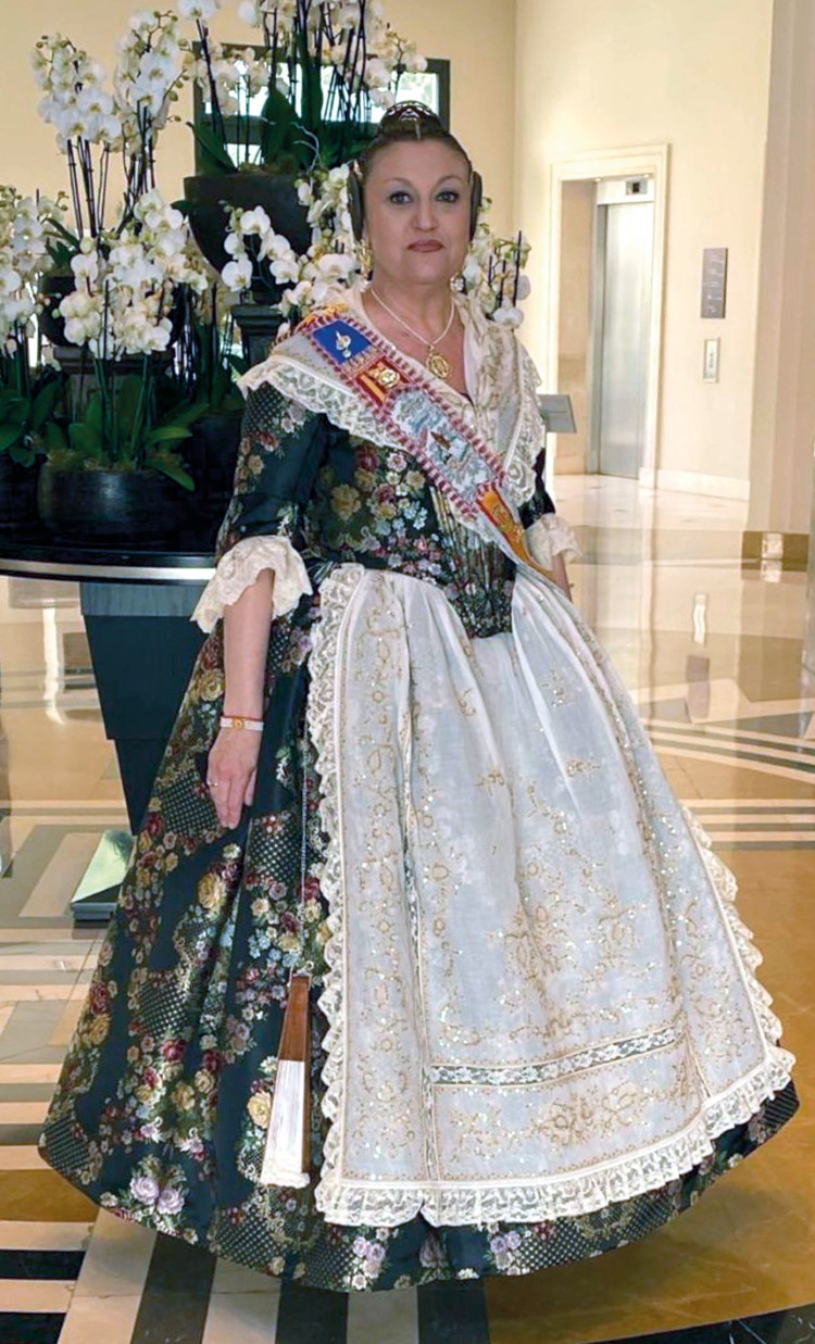 Gloria Palau luce un traje propio de la época estival, que nos muestra la riqueza de nuestro patrimonio textil, confeccionado con una tela estampada tipo indiana de anticuario. El guardapiés y el cuerpo están elaborados con una hechura de transición (principios del siglo XIX). El jubón, envarado con palos de olivo y esparto, y la manga hasta el codo como sucesora de la antigua manga de la camisa. Mocador de pit y delantal en muselina bordados en cadeneta e hilo metálico, adornado con lentejuelas metálicas y guarnecido con encajes.