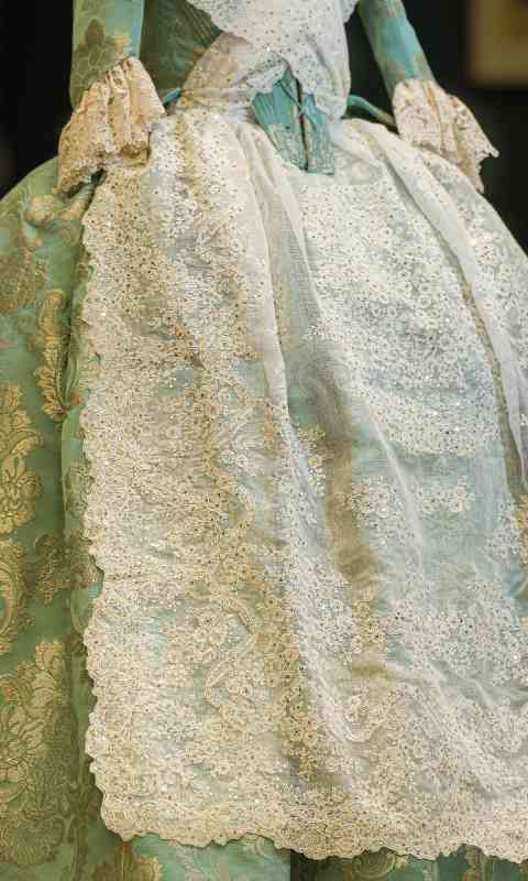 La manteleta del segundo traje de la Corte Mayor está bordada en cadeneta sobre muselina y lentejuela en oro inspirada en un dibujo muy tradicional de s. XVIII caracterizado por dibujos de cestas. En sus terminaciones llevan encaje de valencienne.