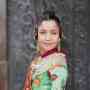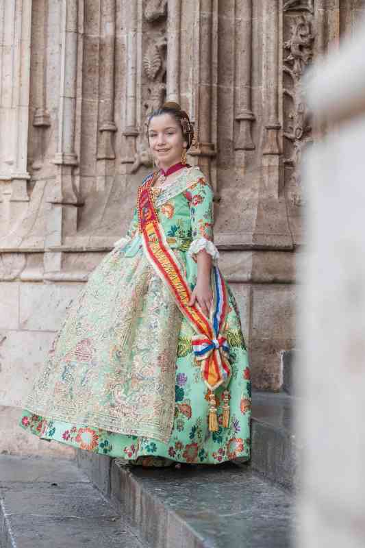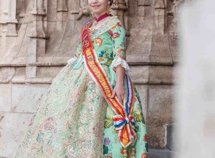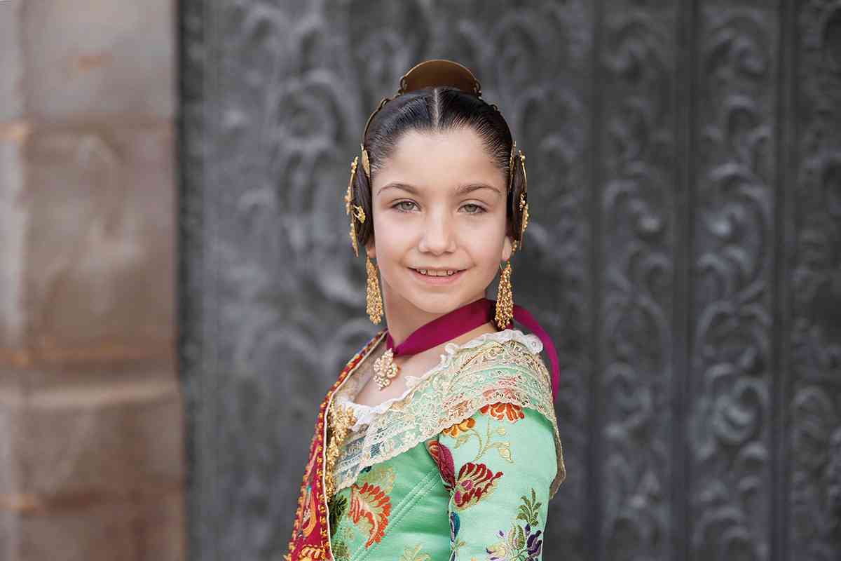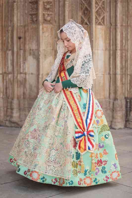 La pequeña vistió un estrecho de seda de nombre San Jorge con 16 colores y dos metales de los antiguos telares de Rafael Catalá, y manteletas de Artesanía Viana con un patronaje afrancesado del siglo XVIII.